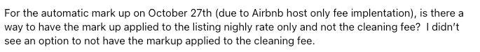 Cleaning and Pet Fee Mark-Up -- Accounting Nightmare From everything I’m reading, the cleaning fee and pet fee will be itemized the same way on reporting. So, if you have a cleaning fee of 130 before mark up, and then that cleaning fee becomes 154 after mark up, I don’t think the breakdown in Airbnb, or any of our metrics or reporting will reflect that cleaning fee as 130, they’ll reflect it as 154, so unless you manually go credit those funds to the service fee debit that happens before payout, then funds won’t properly be allocated to off-set the rate increase.