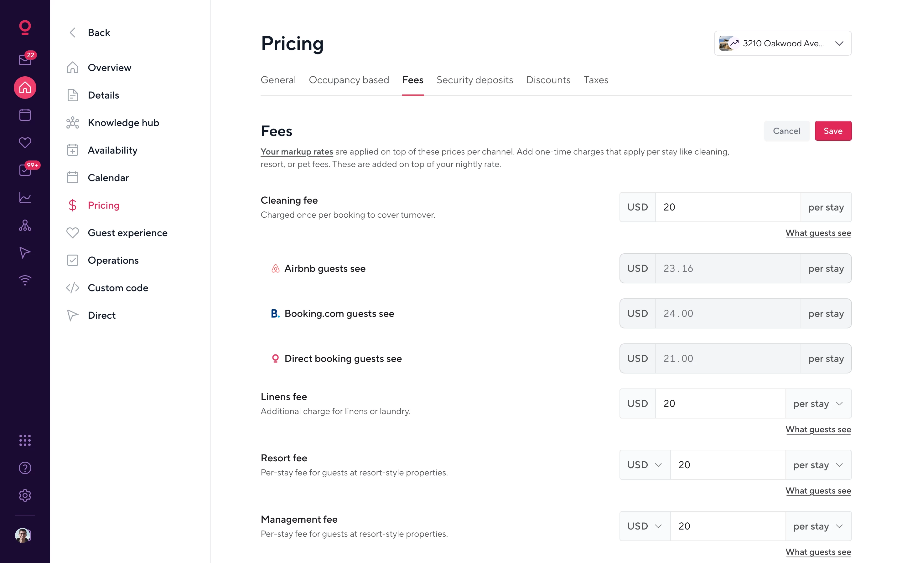 We are just starting out so have kept the cleaning fee the same across the board. I would enjoy being able to keep Hospitable as the source for all my fees, rates etc and truly manage from one spot rather than keeping track of things across multiple platforms.