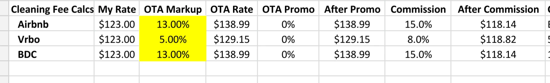 This will be nice to have, as I've previously needed to do spreadsheet math to figure out what the cleaning fee should be on each OTA in order to net the same amount after commissions. Ultimately, it only yielded a $10 difference, but it will help the most with booking.com because I do use their "Visibility Boost" feature, which increases the commission paid to BDC, and until now I've not had an easy way to have my mark-up applied to the the cleaning fee as opposed to just the nightly rate.