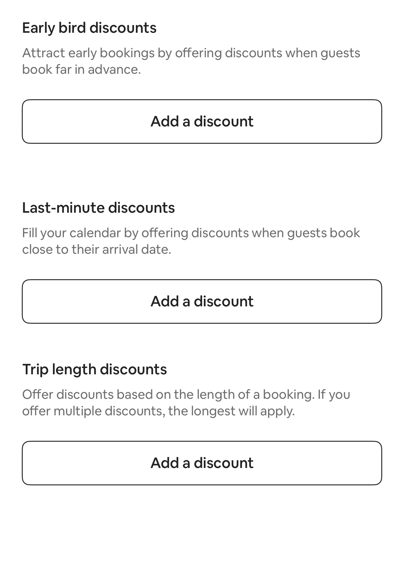 Within Airbnb how many people utilize MULTIPLE discounts like Trip Length, Last Minute and/or Early Bird discounts? Tell me which ones do you have setup or use in Airbnb?