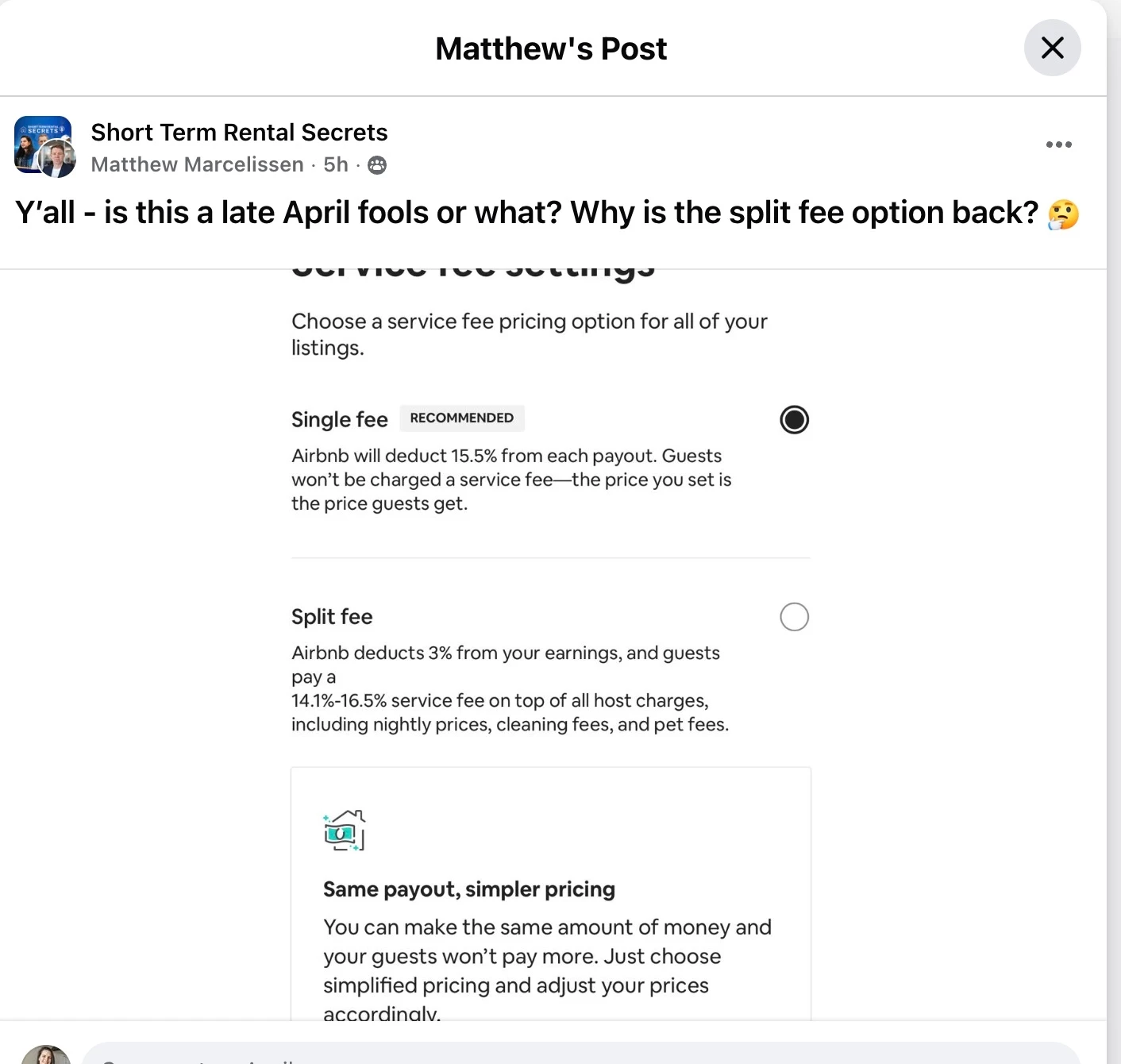 I just saw on a FB post that the split fee option is back for all listings. Anyone else see this and made the change back? What does this mean for the Hospitable AIRBNB Markup?