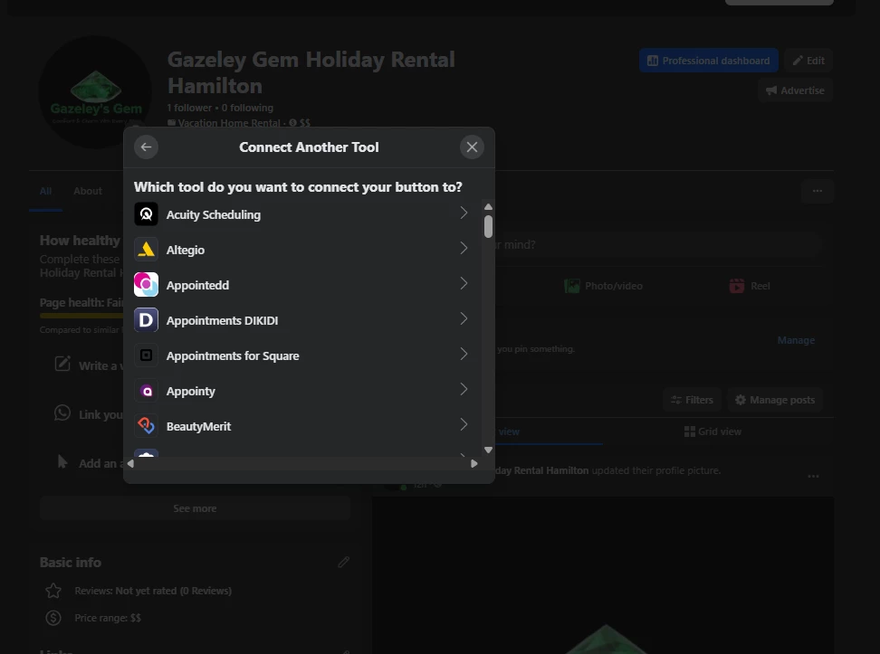 True, there’s no native integration between Facebook and Hospitable. But if I got it right, you can Connect Another Tool > Website Link > Paste your Hospitable Direct booking URL. So basically you can redirect it to your Direct page.