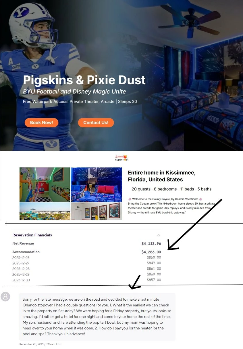 3) You need a website, and an off-platform marketing plan. Sorry, it's 2026. It's time. Start by focusing around compression events. For example on a different property I manage that is mid-tier (very lightly themed, just some wall murals etc) we booked the holidays at $875/nt this year while comps were booking in the $400/nt range. |
