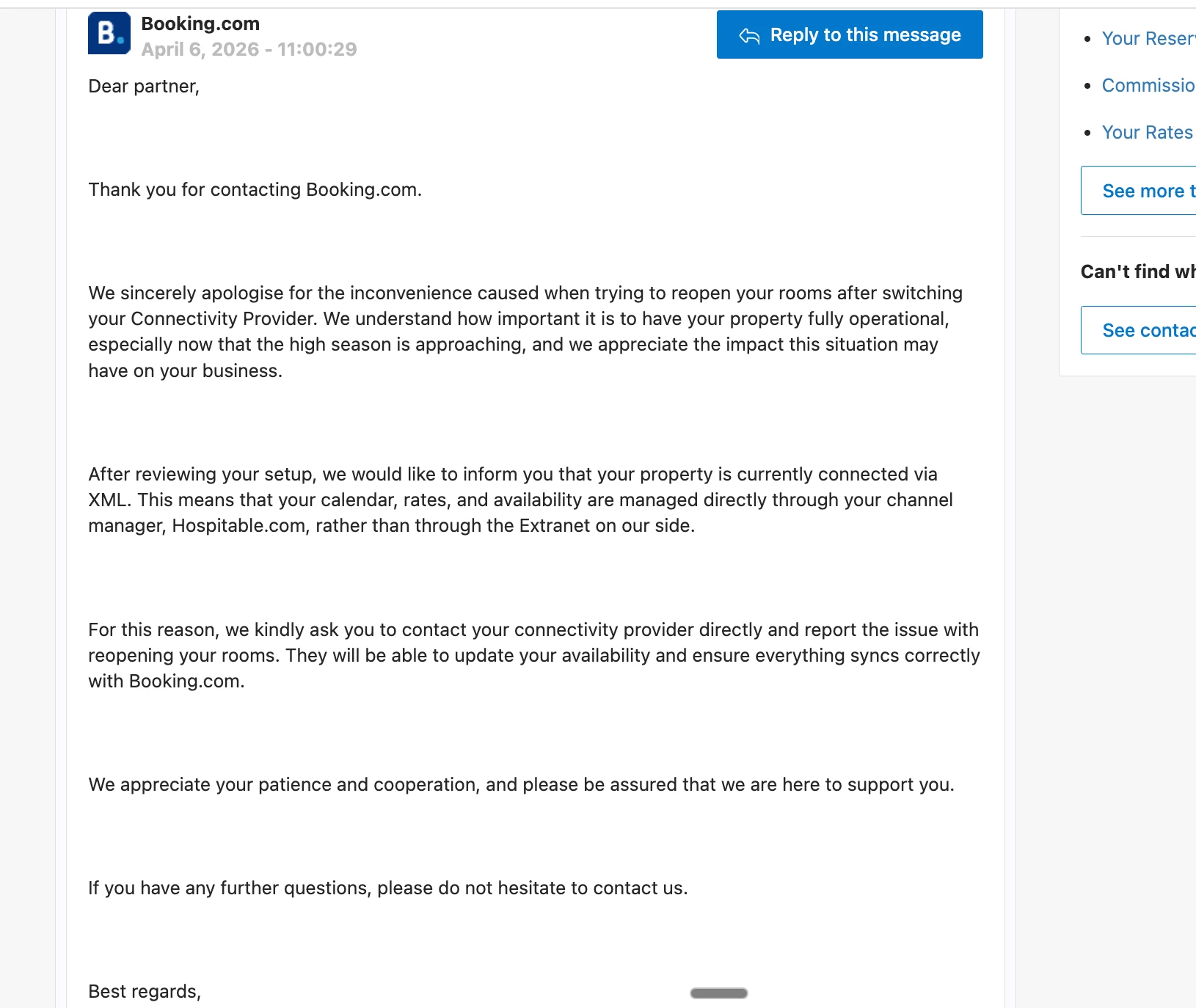 The issue we have is the booking.com rooms are not open and according to the documentation they are setup correctly and we contact booking.com and they said channel is connected correctly but the issue of opening a room lies on the PMS side and no one on support answers.